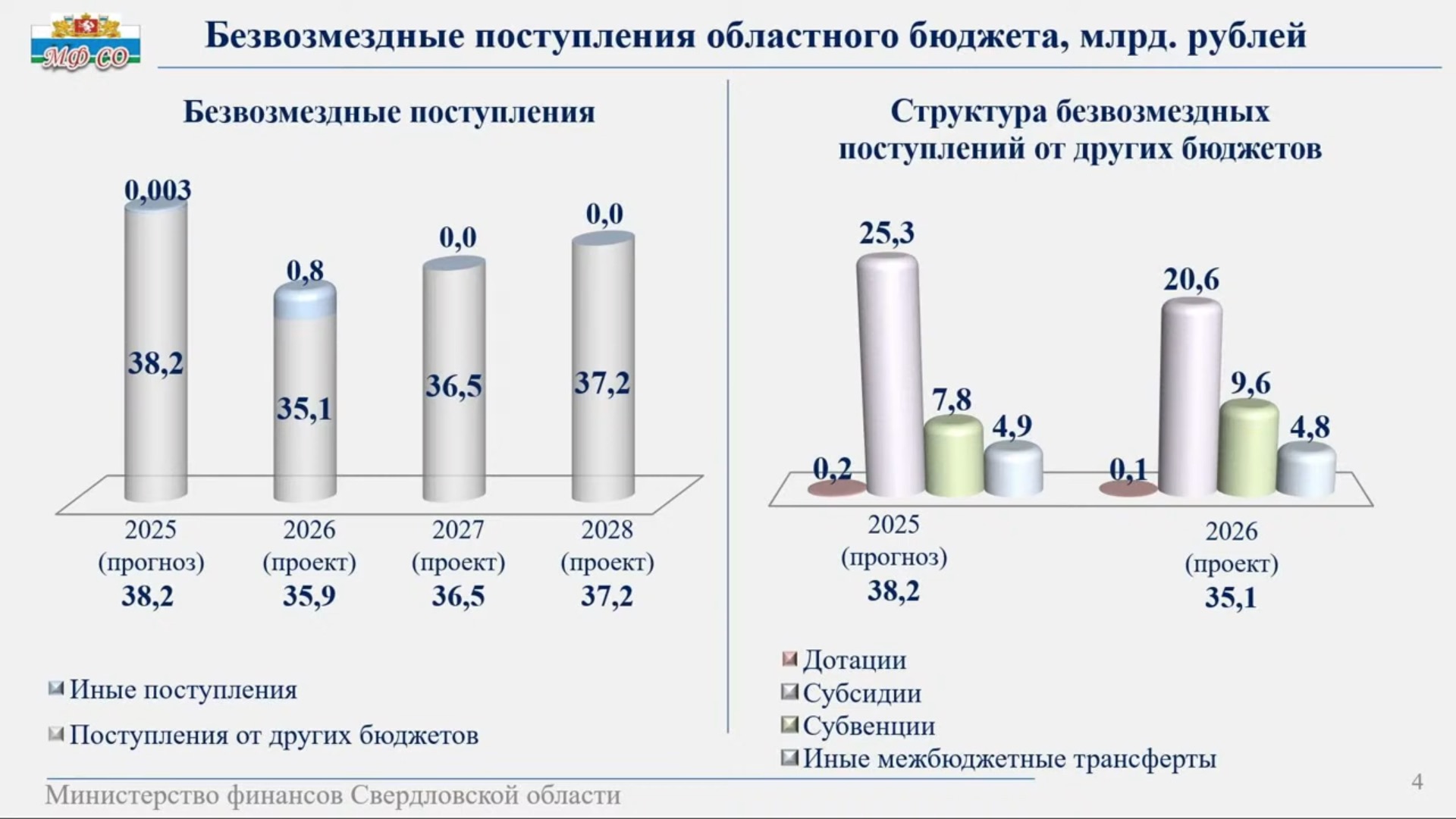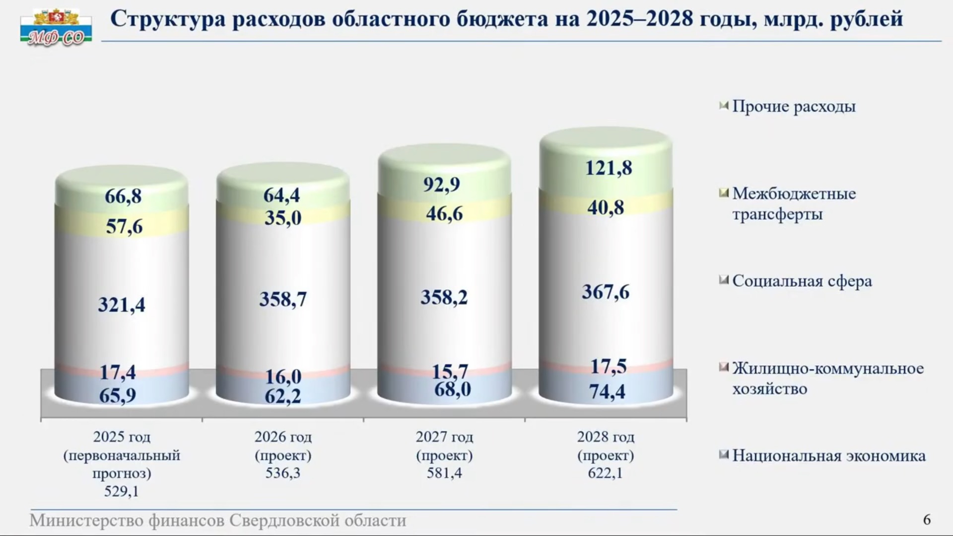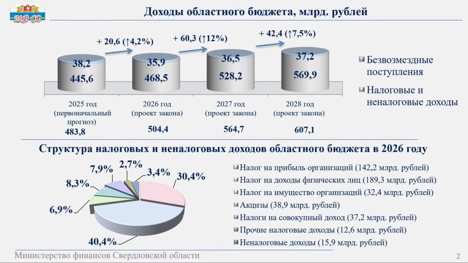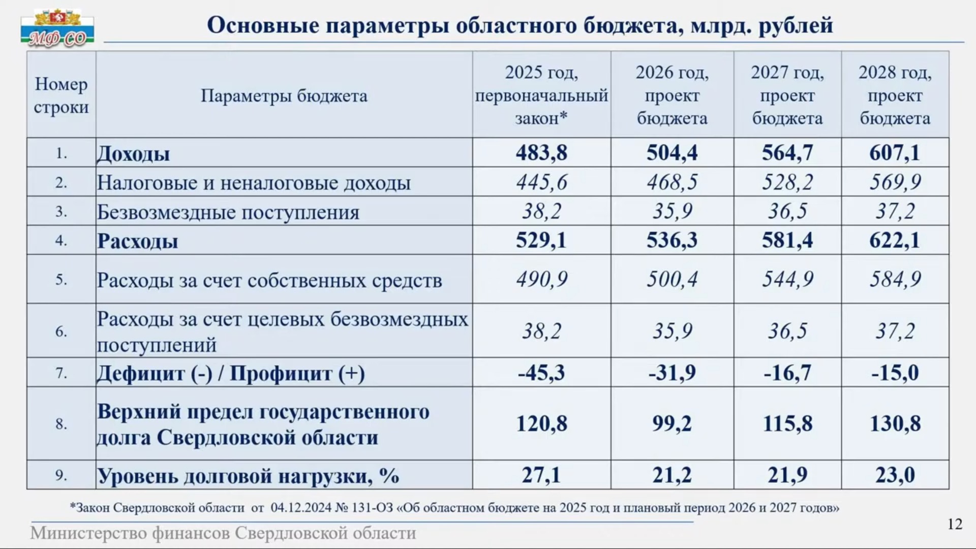 Губернатор Денис Паслер и министр финансов Александр Старков представили в Законодательном собрании проект бюджета Свердловской области на 2026 год и плановый период 2027–2028 годов. Документ, сверстанный на основе базового варианта социально-экономического прогноза, предполагает рост доходов казны на 4,2% по сравнению с текущим годом — до 504,4 млрд руб., в то время как расходы увеличатся на 1,4%, до 536,3 млрд руб. В результате дефицит бюджета сократится до 31,9 млрд руб., что на 13,4 млрд руб. меньше показателя, заложенного в первоначальной версии бюджета-2025.