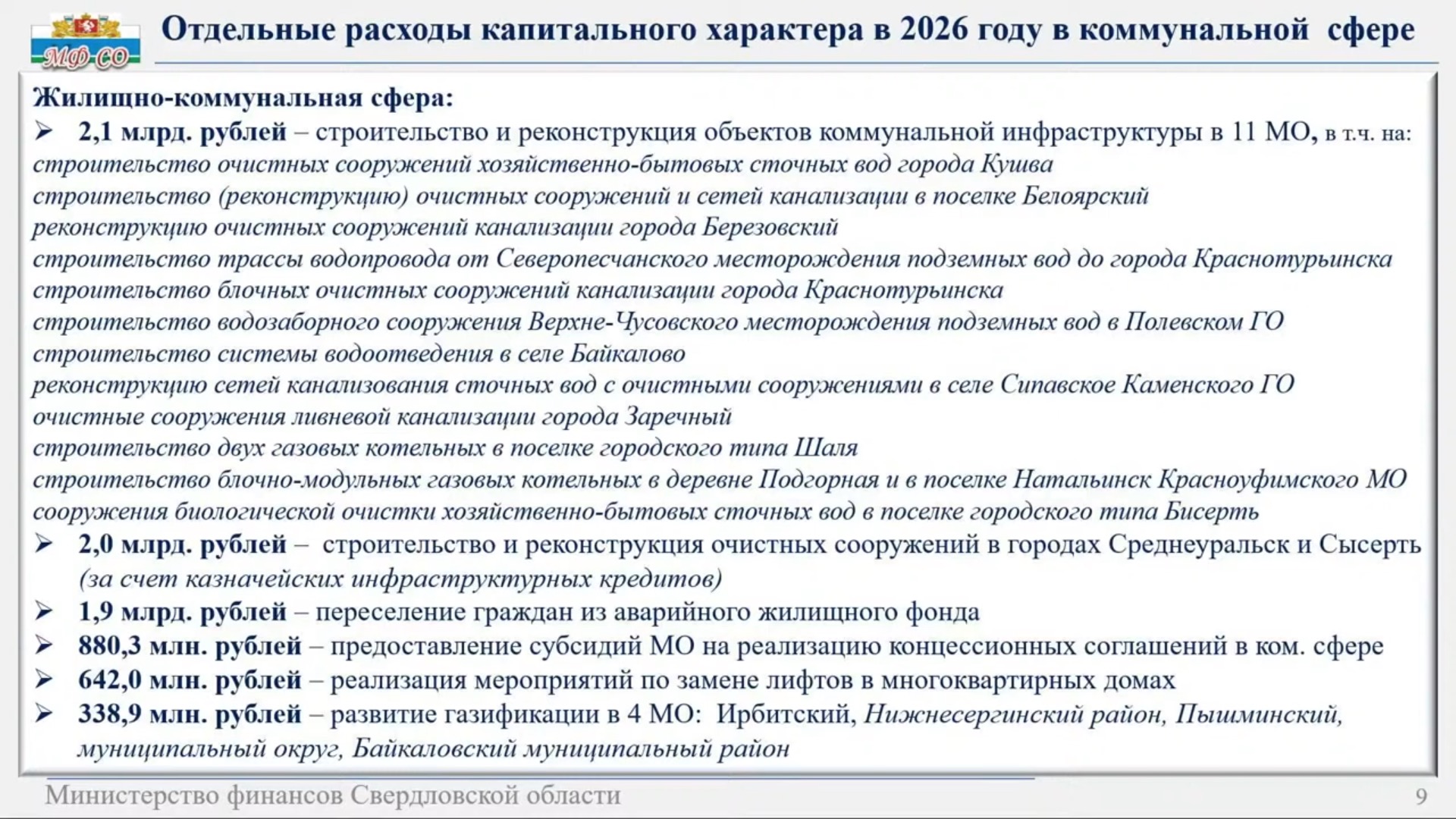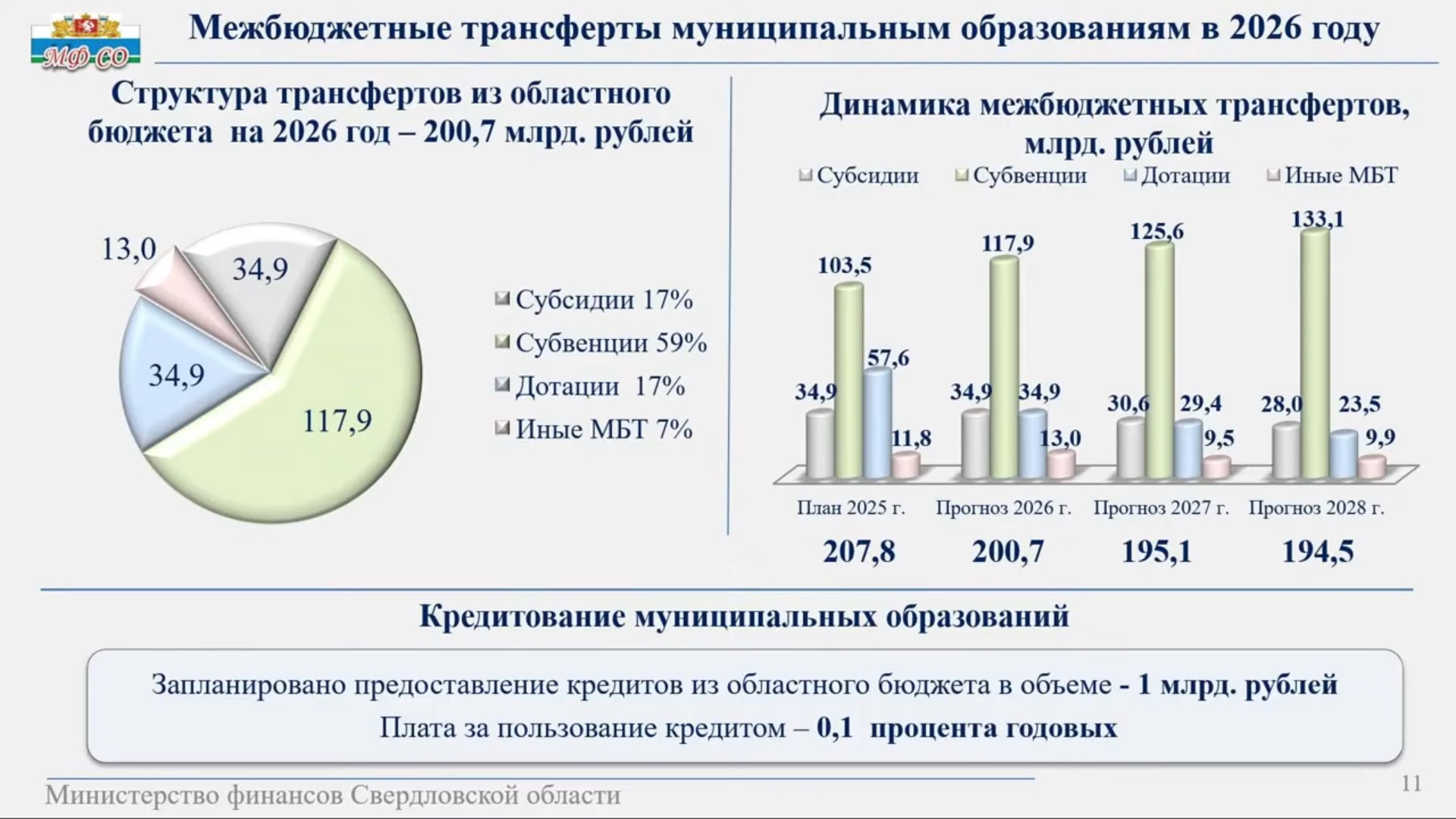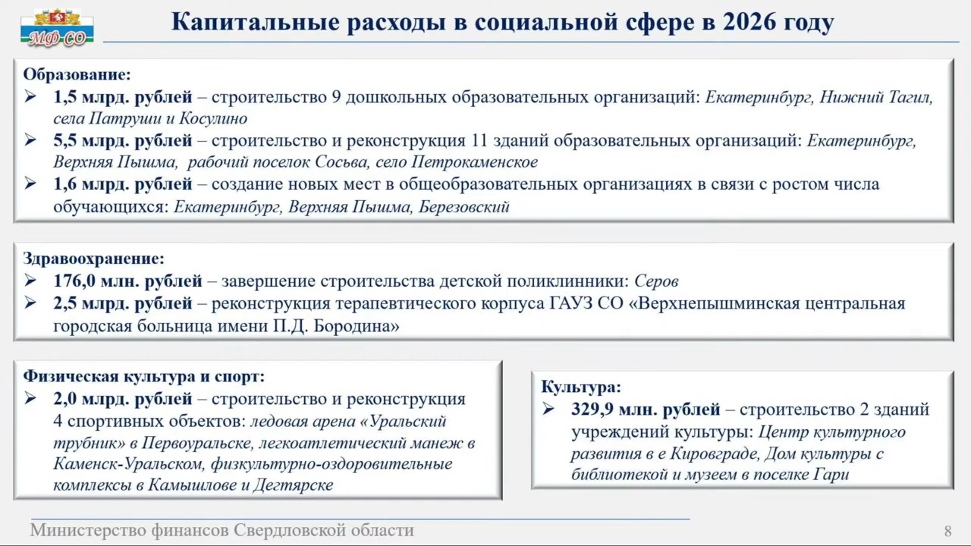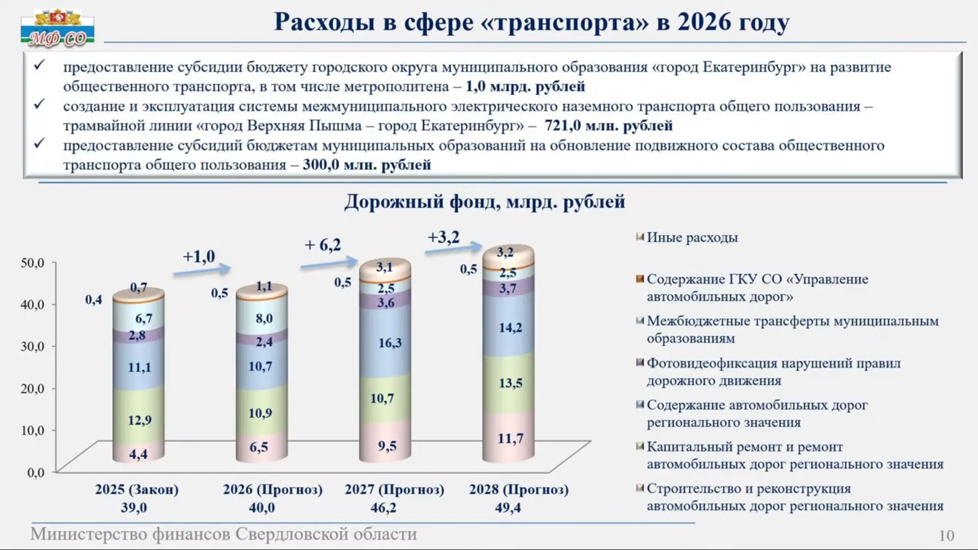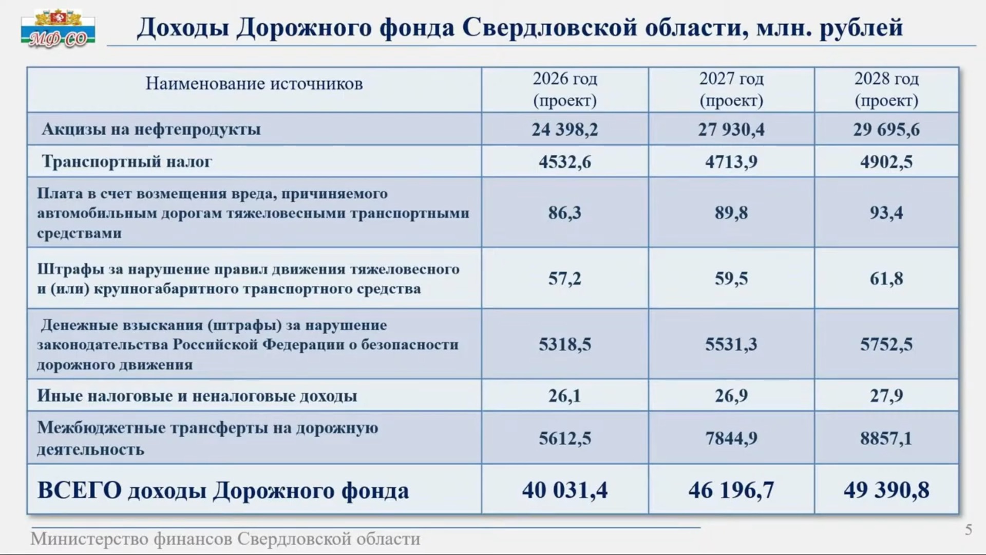 Губернатор Денис Паслер и министр финансов Александр Старков представили в Законодательном собрании проект бюджета Свердловской области на 2026 год и плановый период 2027–2028 годов. Документ, сверстанный на основе базового варианта социально-экономического прогноза, предполагает рост доходов казны на 4,2% по сравнению с текущим годом — до 504,4 млрд руб., в то время как расходы увеличатся на 1,4%, до 536,3 млрд руб. В результате дефицит бюджета сократится до 31,9 млрд руб., что на 13,4 млрд руб. меньше показателя, заложенного в первоначальной версии бюджета-2025.