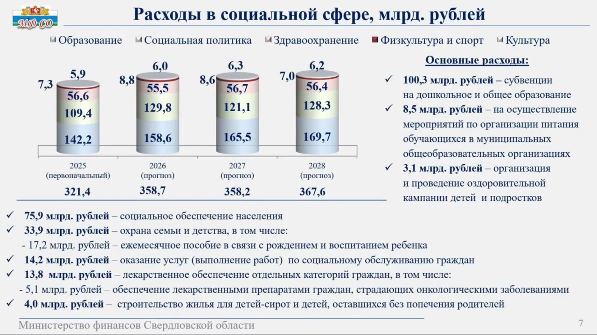 Расходная часть бюджета сохраняет социальную направленность: финансирование этой сферы вырастет на 11,6% (на 37,3 млрд руб.) и достигнет 358,7 млрд руб., что составит 67% от всех трат. Основные социальные статьи расходов включают 100,3 млрд руб. в виде субвенций на дошкольное и общее образование, 8,5 млрд руб. — на организацию питания школьников, 17,2 млрд руб. — на ежемесячные пособия в связи с рождением и воспитанием ребенка, а 4 млрд руб. — на строительство жилья для детей-сирот. В то же время проект предполагает некоторое сокращение финансовой помощи муниципалитетам в виде межбюджетных трансфертов.