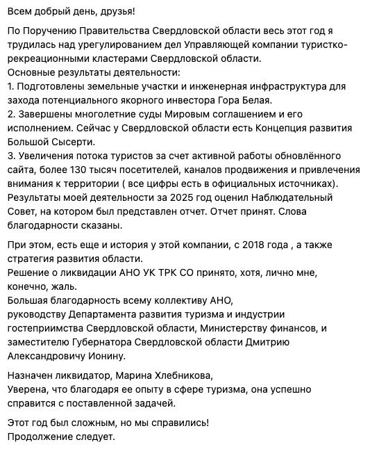АНО «Управляющая компания туристско-рекреационными кластерами Свердловской области» (УК ТРК СО), образованная в 2018 году для создания «Уральского Куршевеля» на базе «Горы Белой», закрывают. Информацию об этом подтвердила уже бывший руководитель организации Светлана Яковлева в своём эмоциональном посте в соцсетях.