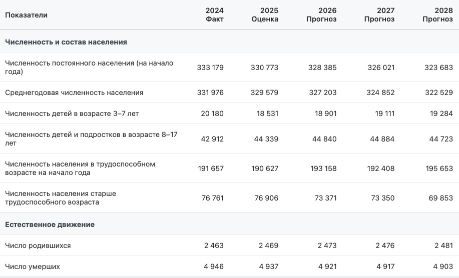 При этом на фоне общего сокращения жителей изменится возрастная структура населения. Прогнозируется, что численность граждан в трудоспособном возрасте вырастет на 5 тыс. человек — с 190,6 тыс. в 2025 году до 195,7 тыс. к началу 2028 года. В то же время число жителей старше трудоспособного возраста сократится на 7 тыс. — с 76,9 тыс. до 69,9 тыс. человек. Количество детей и подростков за этот период останется относительно стабильным.