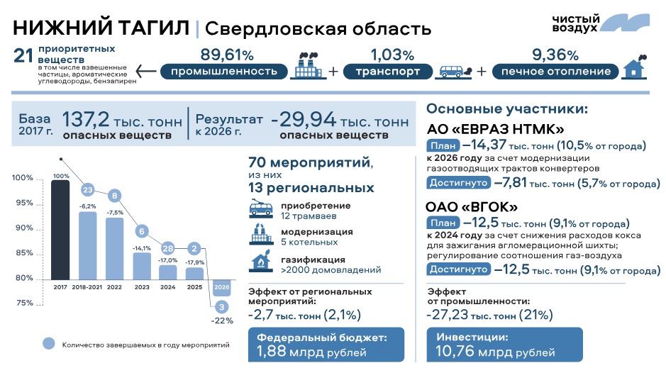 По данным правительства Свердловской области, Нижнему Тагилу уже удалось сократить выбросы в атмосферу на 17% по сравнению с базовым 2017 годом, что в абсолютном выражении составляет 23 тысячи тонн. В перечень реализованных мер вошли модернизация оборудования, оптимизация технологических циклов и внедрение систем очистки на заводах, перевод на газовое отопление 1,7 тысячи частных домов, реконструкция пяти газовых котельных, а также обновление подвижного состава за счет приобретения трамвайных вагонов.