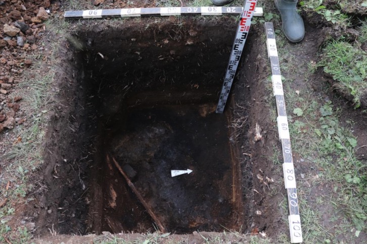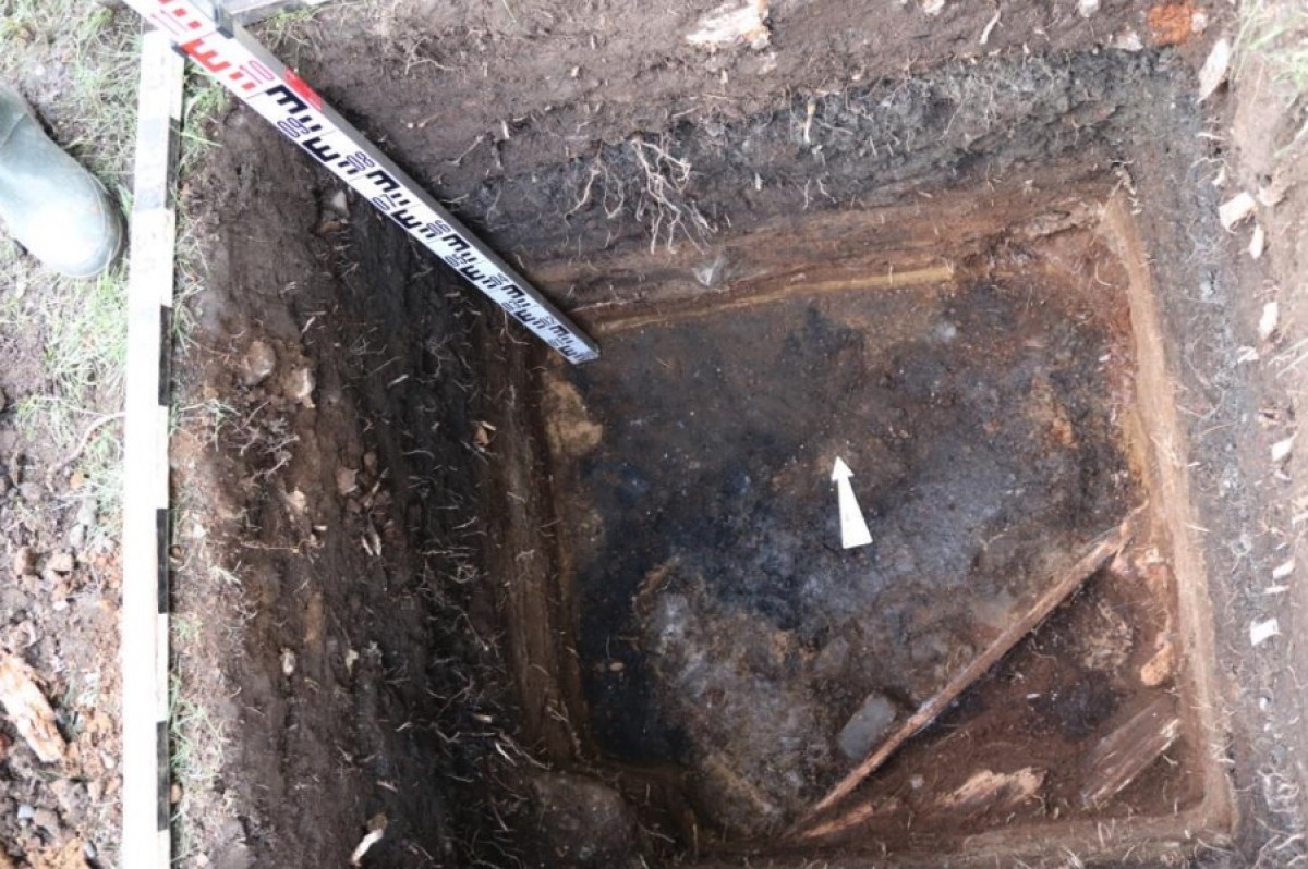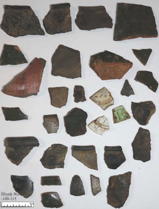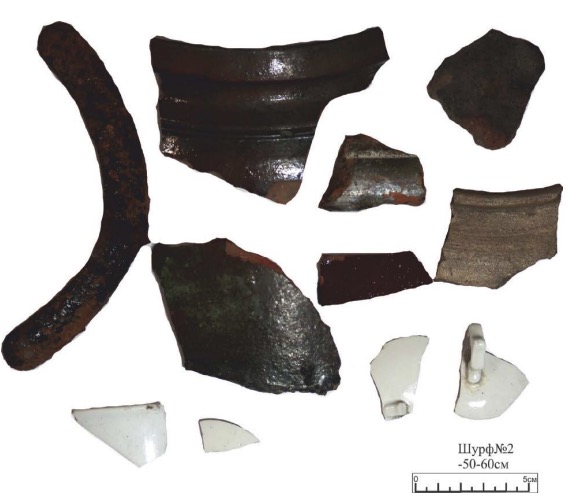 Второй шурф, расположенный в западной части исследуемого участка, также подтвердил наличие богатого культурного слоя на глубине от 100 до 130 сантиметров. Здесь, помимо осколков керамики, стекла и фарфора, была обнаружена деревянная свая толщиной 20 сантиметров, заглубленная в материковый грунт — остаток одного из многочисленных строений, некогда стоявших на площади.
