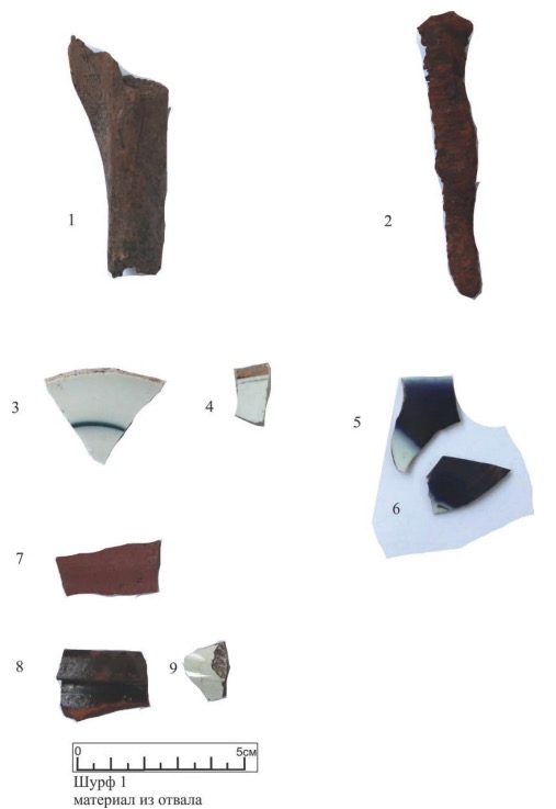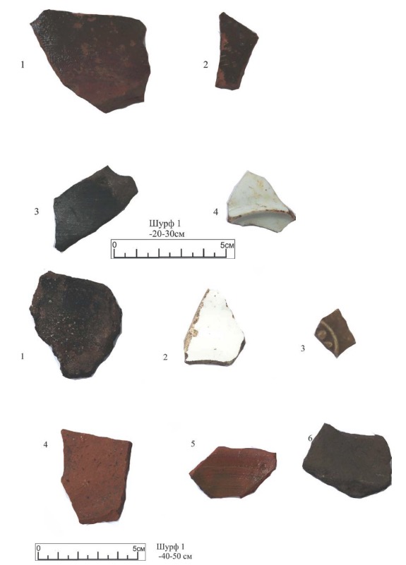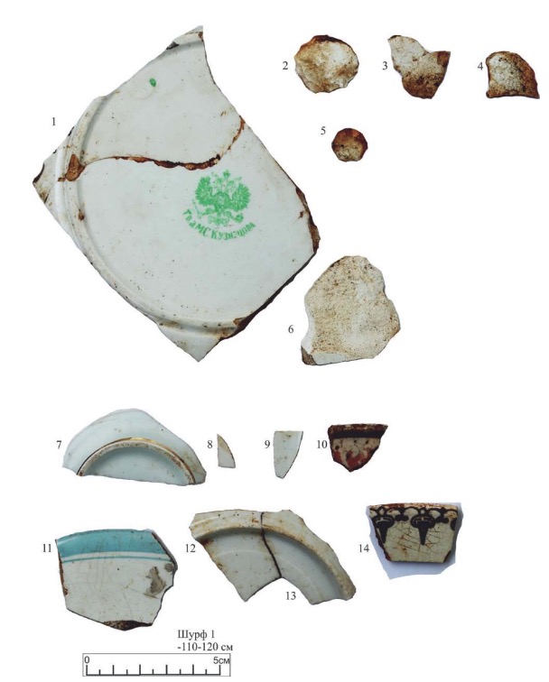 Первый шурф был заложен на территории Комсомольского сквера, в трех метрах от западной границы участка. Уже на глубине 10-20 сантиметров исследователи начали находить фрагменты поливной керамики, фарфора и стекла. Среди находок оказалась сильно корродированная монета номиналом 5 копеек, датированная XIX веком, а также многочисленные металлические шлаки и фрагменты костей животных. Самой ценной находкой в этом шурфе стал развал фарфоровой тарелки с клеймом товарищества М. С. Кузнецова — одного из крупнейших производителей посуды в Российской империи.