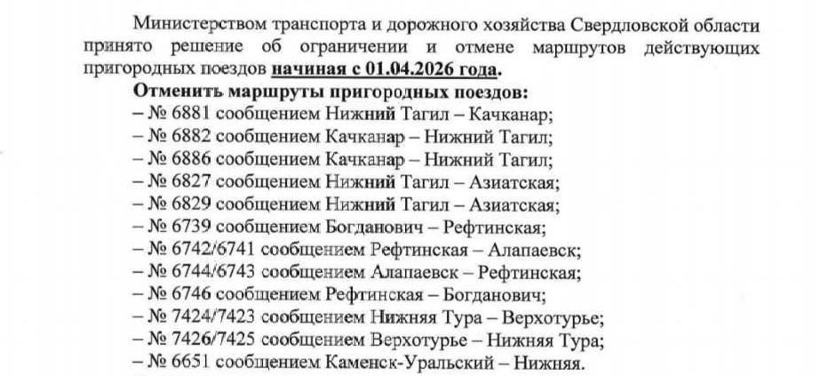 Из расписания уберут поезда № 6881 (Нижний Тагил — Качканар), № 6882 и № 6886 (Качканар — Нижний Тагил), а также рейсы № 6827 и № 6829 (Нижний Тагил — Азиатская). В письме указано, что решение приняло министерство транспорта Свердловской области (власти компенсируют железнодорожникам часть издержек, поэтому управляют маршрутами).