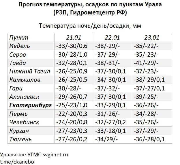 В северных городах пик холодов придется на ночь на четверг, 22 января: в Ивделе ожидается до -38 °C, а в Серове до -37 °C. Для сравнения, в Екатеринбурге максимум холода также наступит в пятничную ночь, однако температура будет немного выше и составит -36 °C. Ослабевать стужа, по информации метеорологов, начнет только к концу недели.