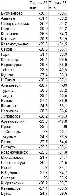 Минувшая ночь стала самой холодной в текущем сезоне, а кое-где и за последние годы. Как сообщили в Уральском гидрометцентре, сразу на шести метеостанциях в Свердловской области столбики термометров опустились ниже отметки в -40 градусов. Абсолютный минимум этой ночи, 23 января, был зафиксирован в Ивделе, где похолодало до -41,2 °C.