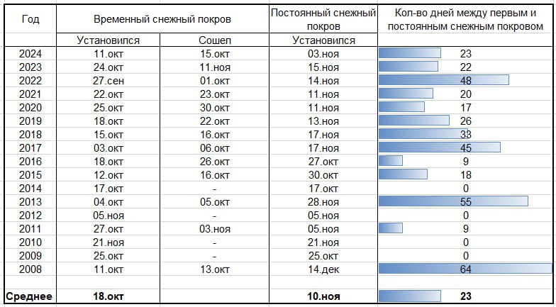 Настоящая зима, с постоянным покровом, который уже не сходит до весны, наступает в среднем 10 ноября. Но и здесь разброс дат весьма значителен. Раньше всего устойчивая зима приходила 17 октября (в 2014 году), а дольше всего ее пришлось ждать в 2008 году — до 14 декабря.