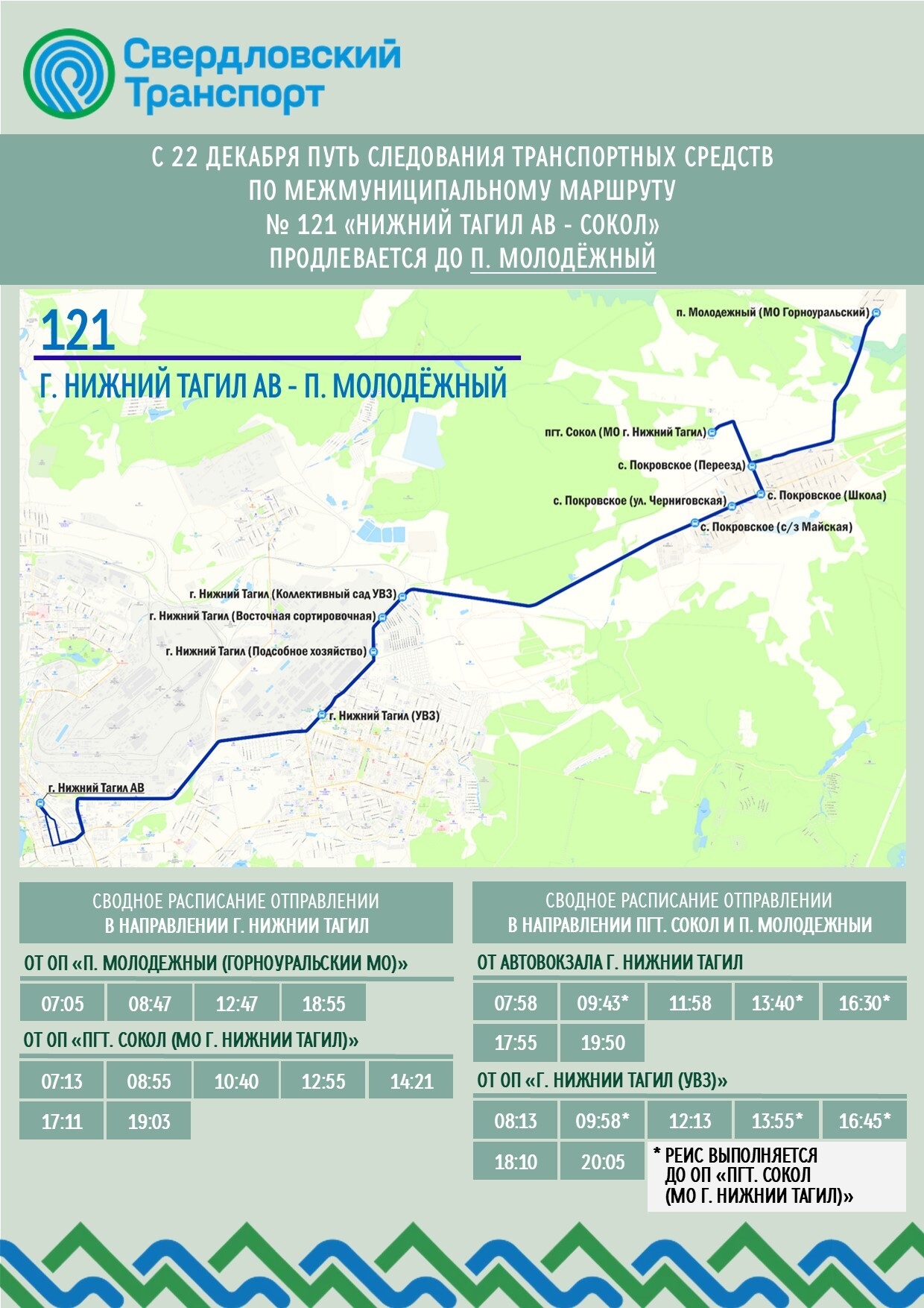 В схему движения пригородных автобусов, связывающих Нижний Тагил с населенными пунктами пригорода, вносятся существенные корректировки. Так, с 22 декабря маршрут № 121 «Нижний Тагил АВ – Сокол» будет продлен до поселка Молодёжный, что улучшит транспортную доступность для его жителей. В связи с этим было сформировано и опубликовано новое сводное расписание отправлений, учитывающее удлинение рейса.