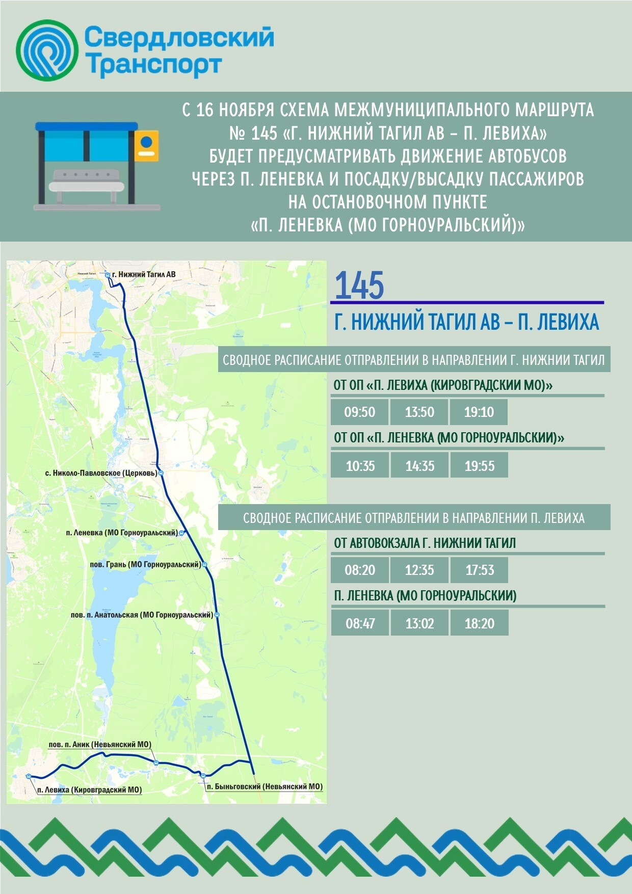 Стоит отметить, что это не единственное изменение за последнее время. Ранее, с 16 ноября, уже была скорректирована траектория движения автобуса № 145 «Нижний Тагил АВ – Левиха». Для удобства пассажиров в нее был включен обязательный заезд в поселок Ленёвка, что также потребовало обновления графика движения.