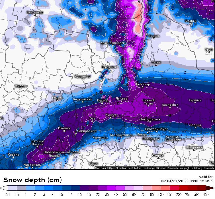Непогода будет сопровождаться резким похолоданием, дневные температуры опустятся ниже нуля, поэтому осадки с большой долей вероятности выпадут в виде снега. Ведущая европейская модель ECMWF к утру 21 апреля обещает в Нижнем Тагиле снежный покров высотой в 30 см.