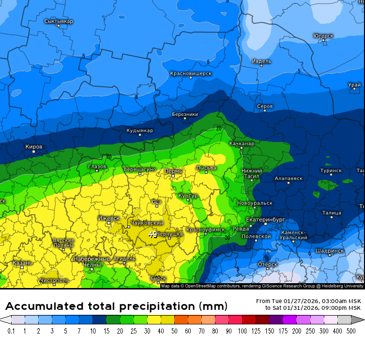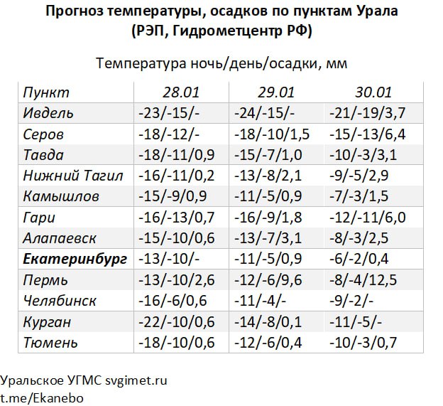 Между тем прогноз Уральского гидрометцентра более оптимистичен: Нижнему Тагилу за период 29–30 января (но без учета 31 января) обещают 5 мм осадков, а Екатеринбург и вовсе лишь немного запорошит.
