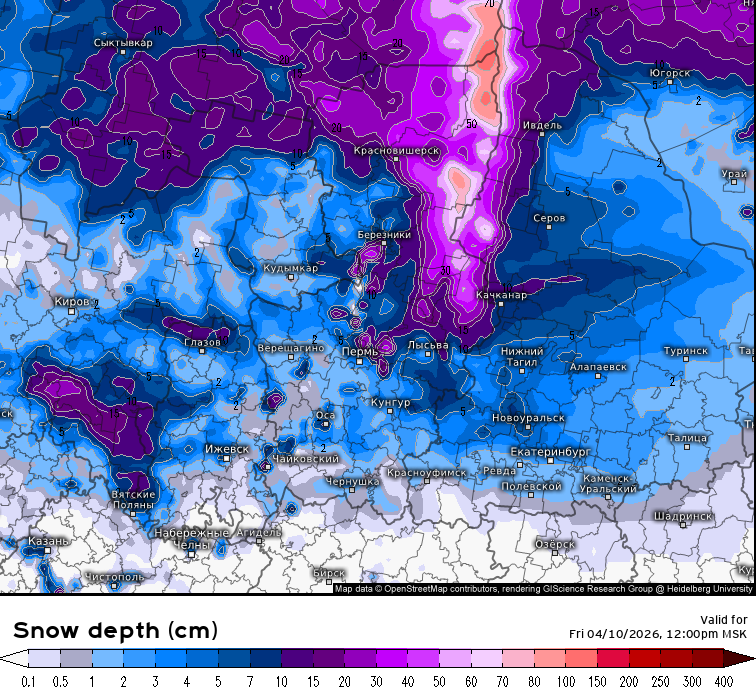 Прогноз ведущей модели ECMWF дает представление о масштабах и распределении непогоды: снежный покров образуется на большей части региона. В Нижнем Тагиле его высота ожидается на уровне 5 см, в Екатеринбурге чуть меньше, а в районе Качканара и вовсе достигнет 20 см. На карте ожидаемая высота снежного покрова к полудню пятницы, 10 апреля: