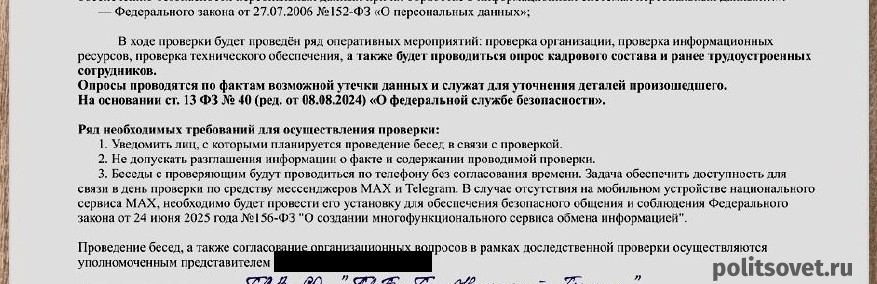 Для придания убедительности своим словам аферист прислал женщине поддельное постановление о проведении проверки. В одном из пунктов этого документа содержалось требование обеспечить связь через два приложения, включая обязательную установку российского сервиса. «Задача обеспечить доступность для связи в день проверки по средству мессенджеров MAX и Telegram. В случае отсутствия на мобильном устройстве национального сервиса MAX, необходимо будет провести его установку для обеспечения безопасности общения», — цитирует фейковый документ «Политсовет».
