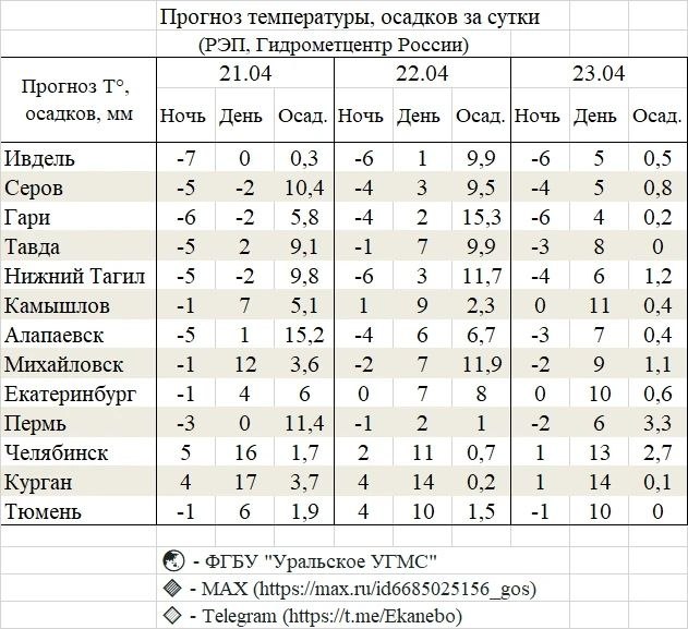 Наибольшее количество влаги, согласно прогнозу, с 21 по 23 апреля обрушится на Нижний Тагил, где суммарно может выпасть до 22,7 мм осадков. Для сравнения, вся апрельская норма для составляет 29 мм. Значительные осадки также ожидаются в Алапаевске (22,3 мм), Гарях (21,3 мм) и Серове (20,7 мм). В Михайловске прогнозируется до 16,6 мм, а в столице Урала, Екатеринбурге, — до 14,6 мм.