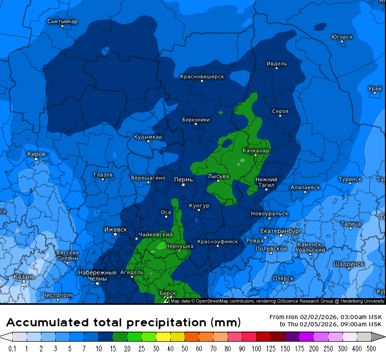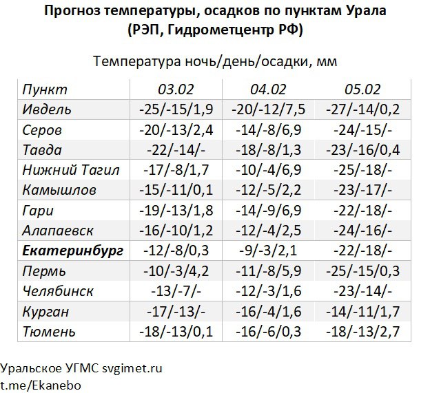 Среди крупных городов близко к эпицентру непогоды окажется Нижний Тагил, где за 3 и 4 февраля прогнозируется около 10 мм осадков (1 мм в жидком виде эквивалентен 1-1,5 см высоты снежного покрова). В Екатеринбурге же синоптики ожидают всего 2-3 мм.
