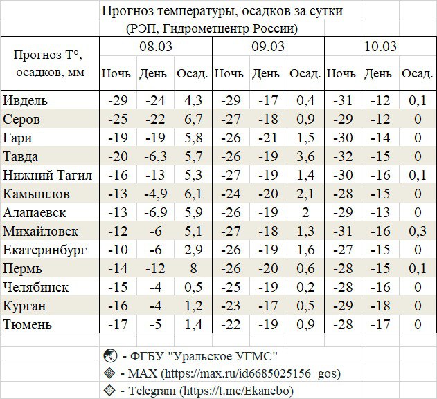 Наиболее низкие температуры, по прогнозам синоптиков, ожидаются в ночные часы 9 и 10 марта. В большинстве районов области похолодает до -27...-33 °C. Так, в Нижнем Тагиле в ночь на 9 марта термометры покажут -27 °C, а в ночь на 10 марта — уже -30 °C. В Екатеринбурге после относительно теплой ночи 8 марта (-10 °C) температура резко упадет до -26 °C и -27 °C в последующие двое суток. В северных городах, таких как Ивдель, морозы будут еще ощутимее — до -31 °C.