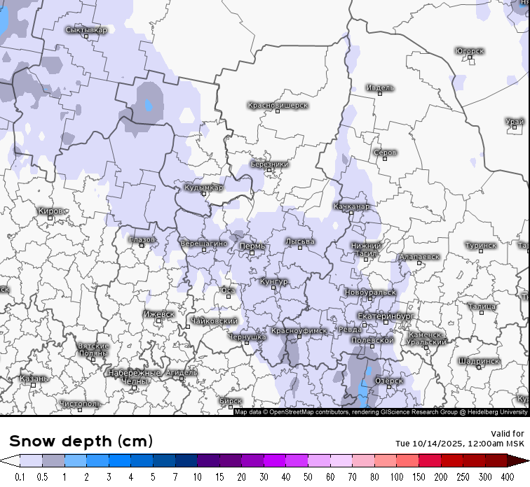 На карте ниже показана ожидаемая высота снежного покрова к полуночи вторника, 14 октября. Судя по данным европейской модели ECMWF, он будет незначительным и ляжет неравномерно, преимущественно в западной и северной частях региона. Его высота не превысит 1–2 сантиметра.