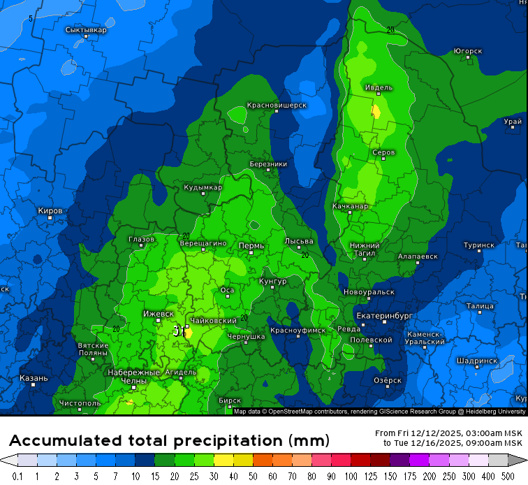 Судя по обновленной карте накопленных осадков Европейского центра среднесрочных прогнозов погоды (ECMWF), основной удар примет на себя северная и западная часть Свердловской области. В «красной зоне» окажутся Ивдель, Серов и Качканар, где ко вторнику может выпасть до 30-40 мм осадков в жидком эквиваленте, что при текущих температурах соответствует приросту снежного покрова примерно на 30-40 сантиметров. Значительные снегопады также прогнозируются в районе Нижнего Тагила (15-20 мм). Екатеринбург стихия тоже не обойдет стороной, однако здесь интенсивность осадков будет несколько ниже.