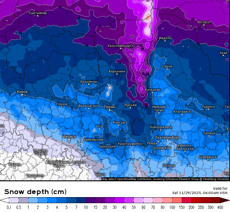 На карте — ожидаемая высота снежного покрова к утру субботы по версии модели ECMWF. В Нижнем Тагиле прогнозируется порядка 4 см, в Екатеринбурге — чуть меньше. Больше всего осадков достанется западной части области: