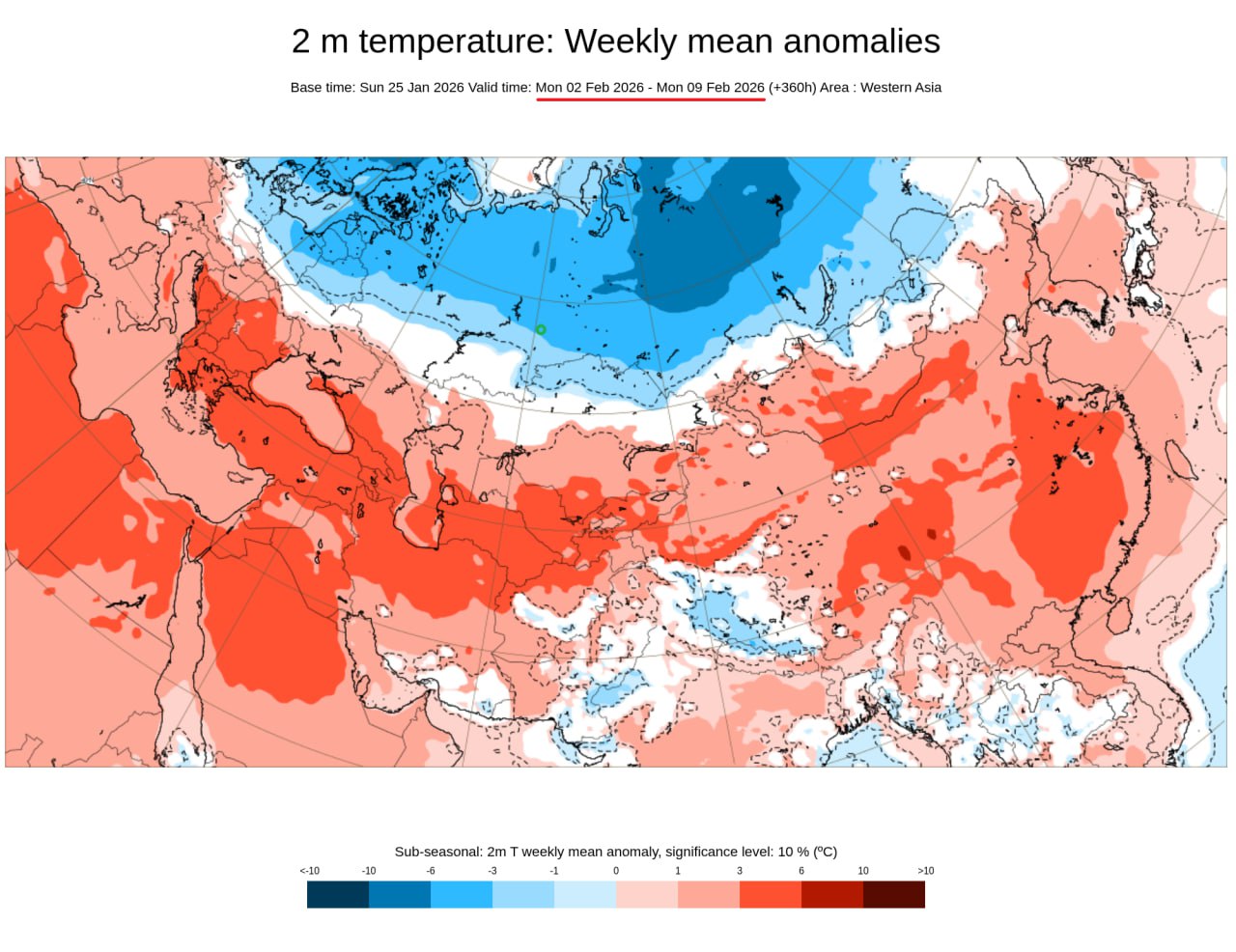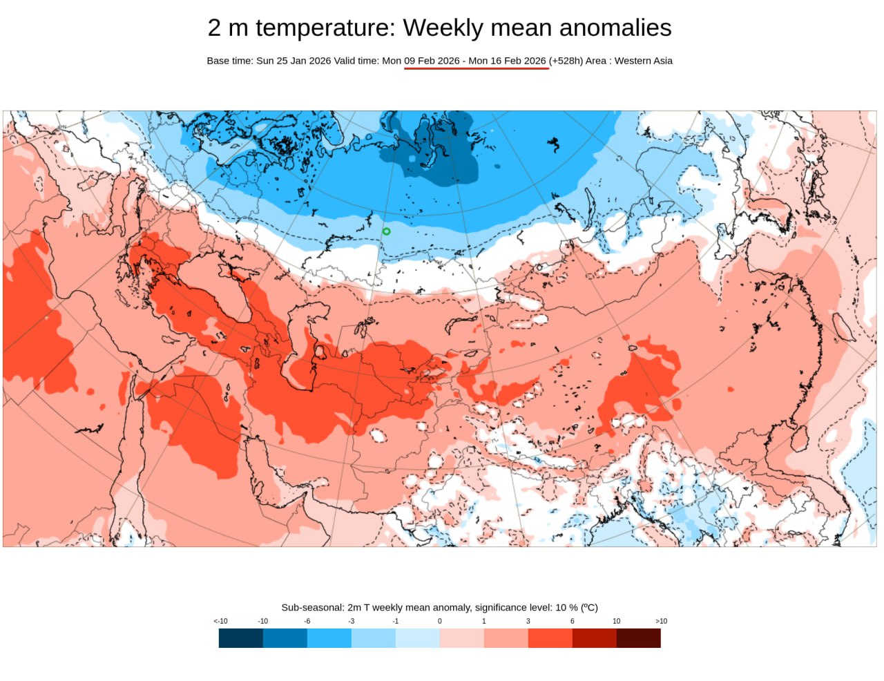 На графических материалах, демонстрирующих распределение температурных отклонений на первую и вторую недели месяца, территория Свердловской области находится в зоне выраженных отрицательных аномалий. Это указывает на то, что средняя температура воздуха в этот период будет заметно ниже климатической нормы: на 3-6 °C в период 2-9 февраля и на 1-3 °C 9-16 февраля. Екатеринбург обозначен зеленым кружком: